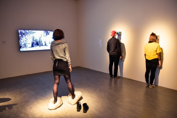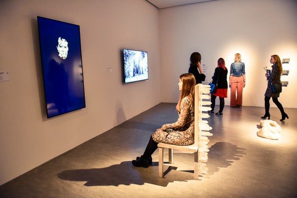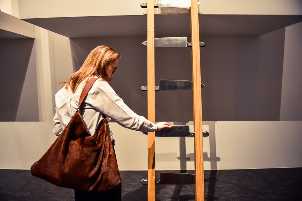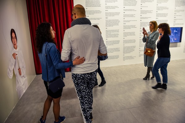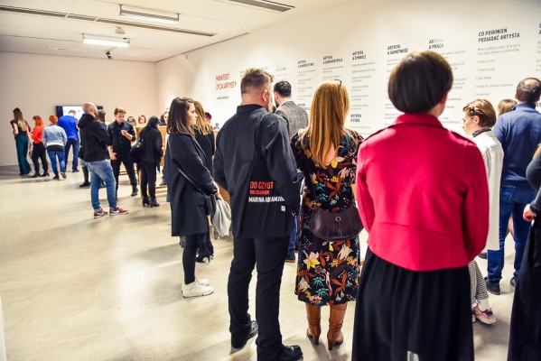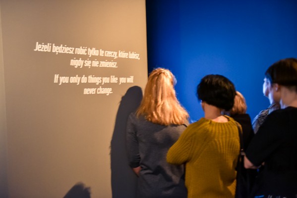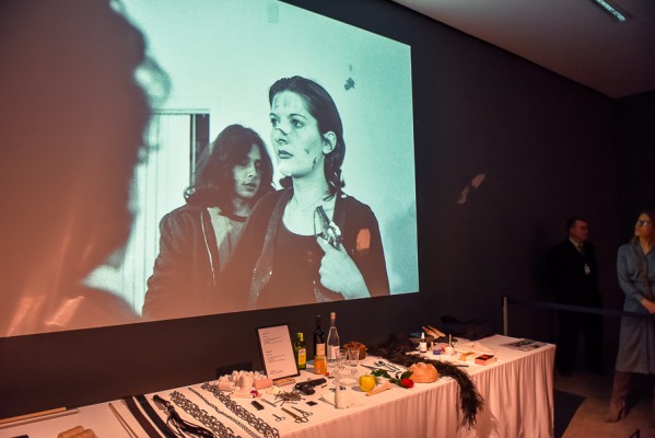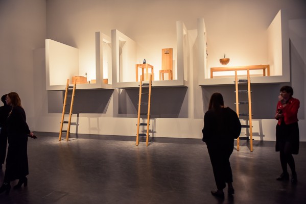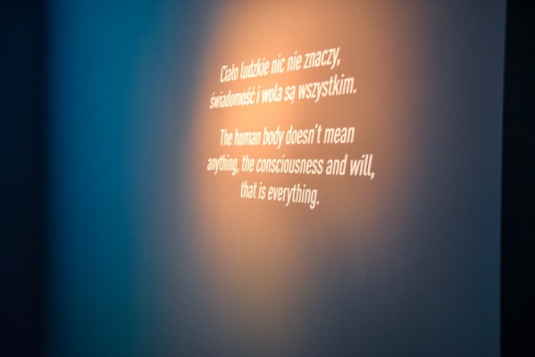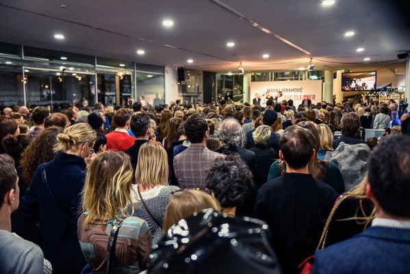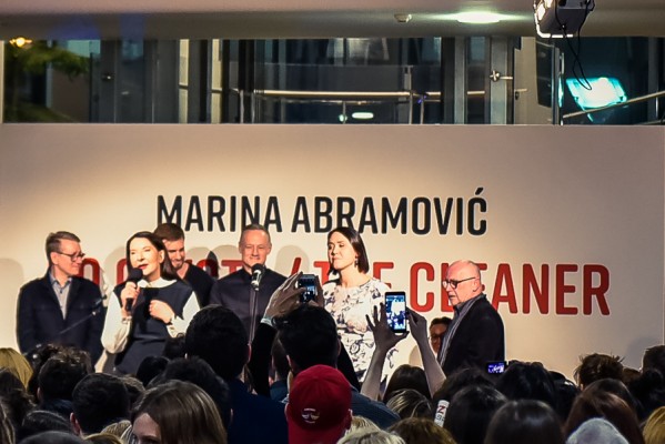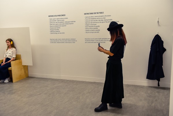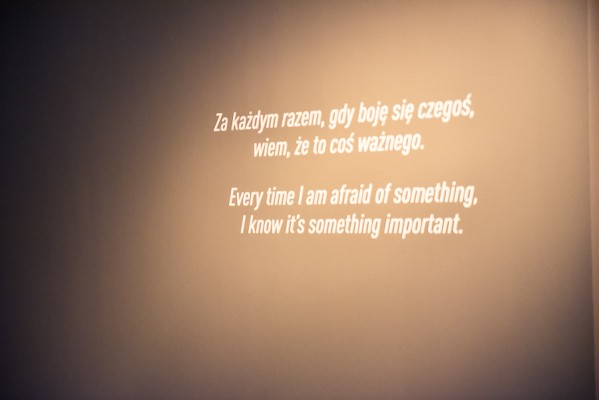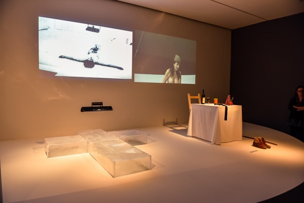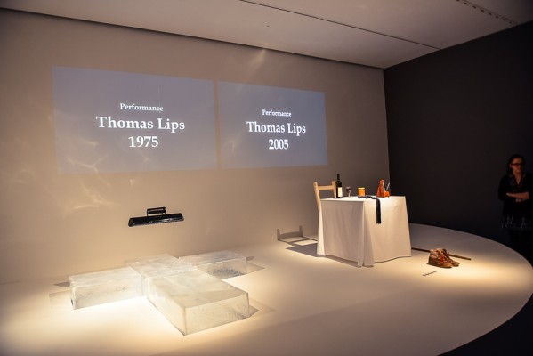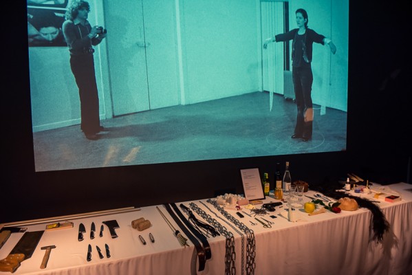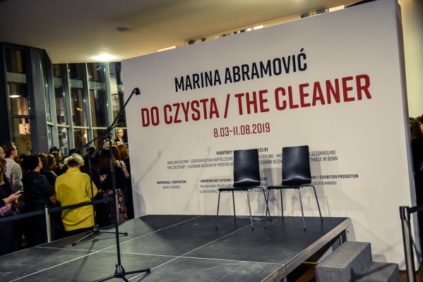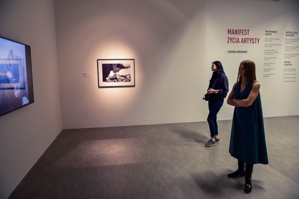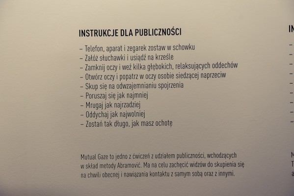 Przede wszystkim na wernisażu była obecna Artystka, która wygłosiła kilka słów na otwarcie i zakończenie przemówień, niestety chwilę potem pozostała już niewidoczna i nieuchwytna dla publiczności. A ta dopisała aż w nadmiarze na stosunkowo niewielkiej powierzchni. Ale za to wystawa się broni! Przedmioty, zdjęcia i instalacje video z najważniejszych performansów Mariny. Jest zabudowa The House with the Ocean View , podczas którego Marina przez 12 dni występowała w Nowym Jorku, mieszkając na scenie na oczach publiczności i wspinając się po schodach stanowiących ostrze noża. Są nagrania video z Rytmu 10, performansu The Artist is Present, podczas którego Marina przez 3 miesiące siedziała naprzeciwko zmieniających się widzów, by nieruchomo i w milczeniu patrzeć im w oczy. Są zdjęcia i nagrania z performansów z Ulayem, wielką miłością Mariny, z którym przez 12 lat żyła i wspólnie tworzyła.